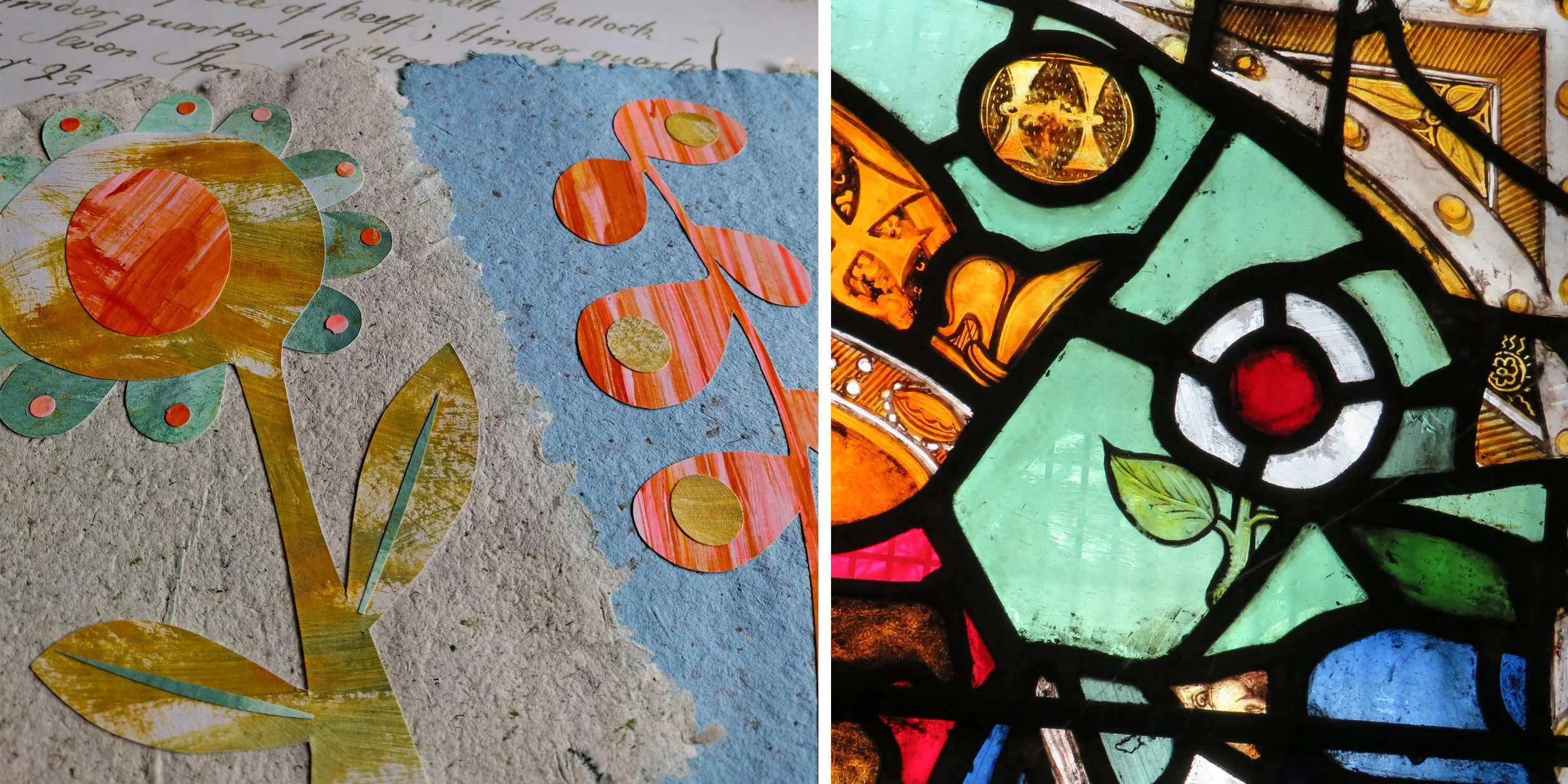 Collaged botanical designs on hand made paper (left) inspired by the incredible stained glass windows of St Mary Magdalene (right)
