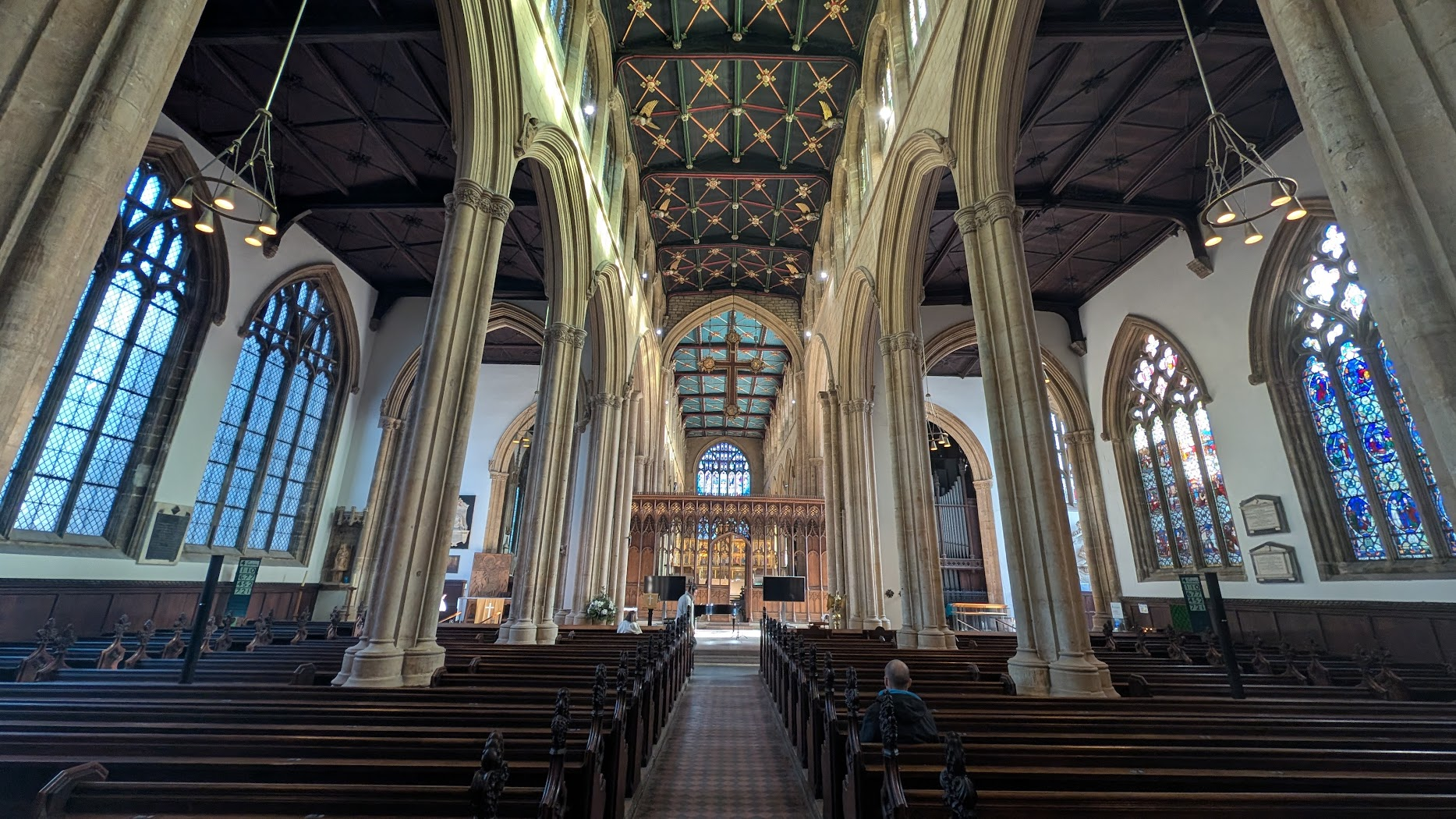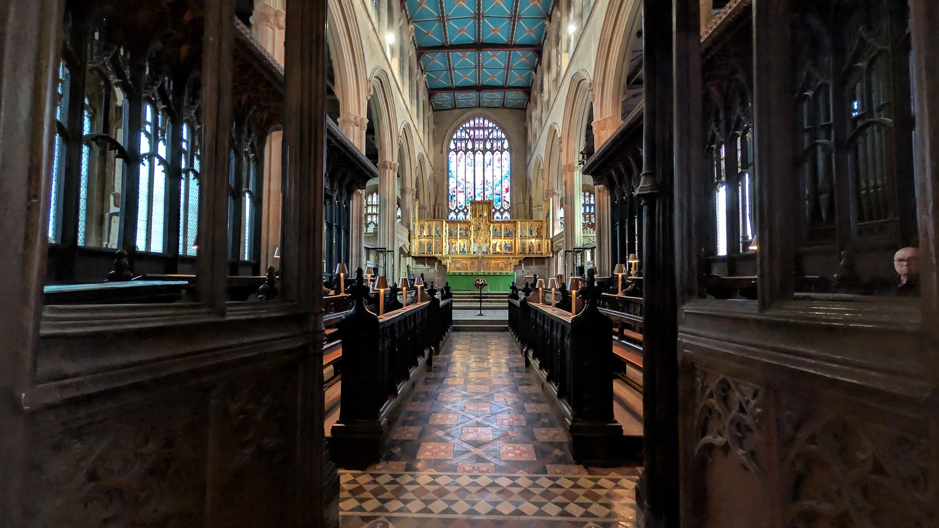 And then suddenly — BAM! — the whole church reveals itself at once: the soaring columns reaching heavenwards, the altar screen glinting with its golden sheen in the distance. It is a moment of pure, medieval revelation.