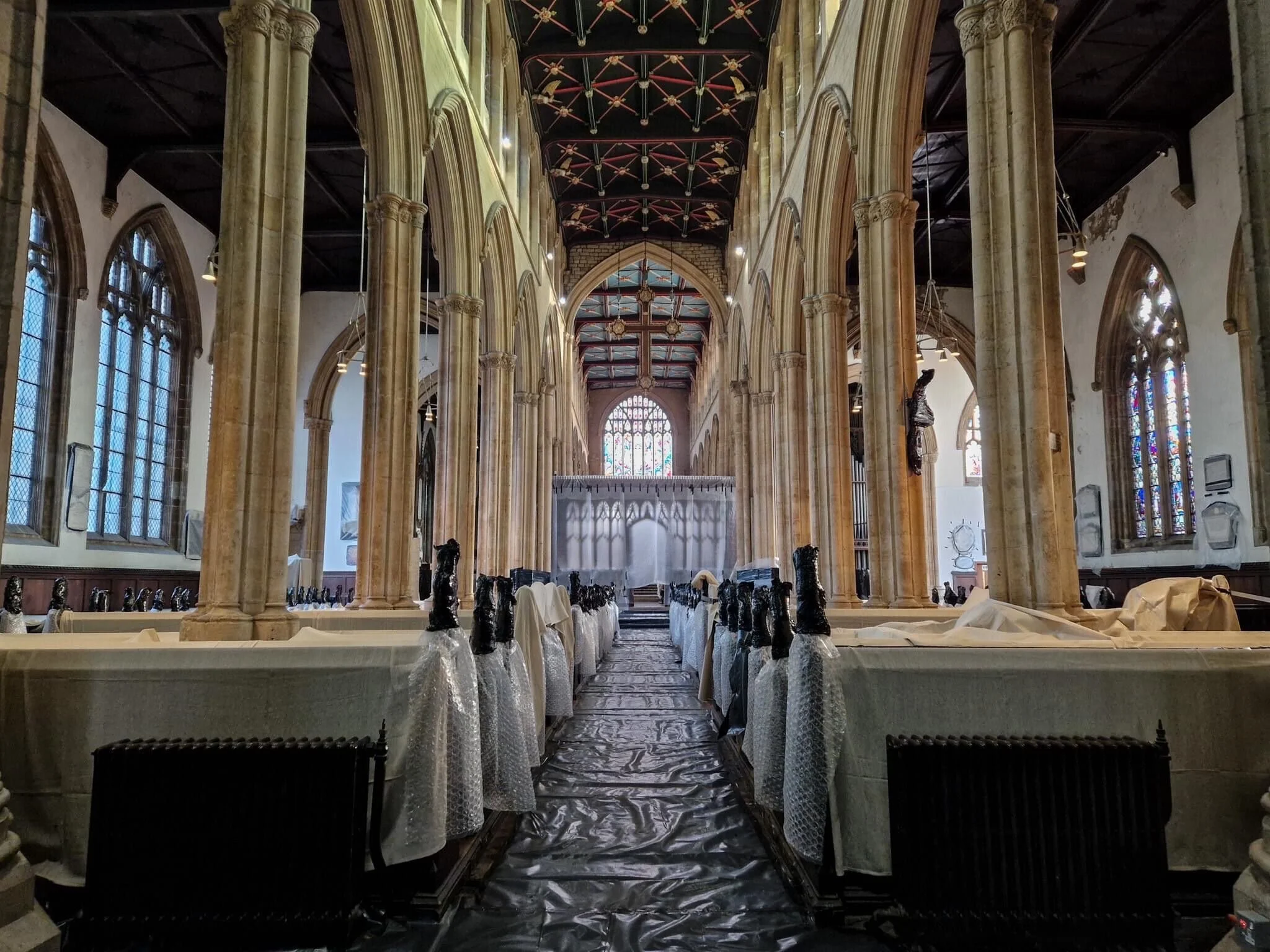Looking down the central aisle towards the chancel and altar; the church is wrapped and protected for the Reawakening